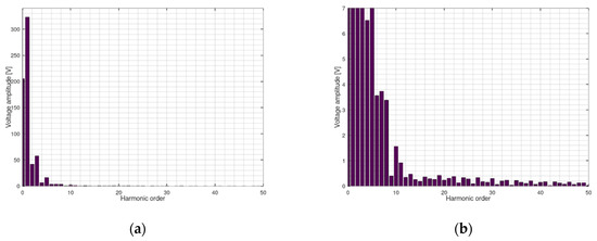 Figure 8a,b shows the harmonic spectrum of the voltage across the nonlinear element shown in Figure 7a and its detail of Figure 7b. As mentioned above, once determined, the value of the equivalent source can be computed corresponding to the nonlinear element, all the other currents and voltages for the other circuit elements. Figure 9 shows the current time evolution through the nonlinear element. Figure 10 shows (a) the current through the generator of the network and (b) the current through inductance L1.