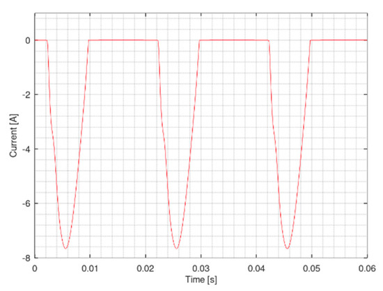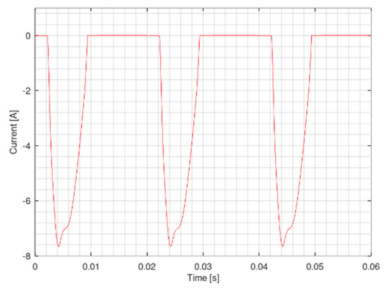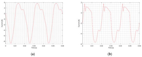 The Gibbs effect can once again be seen in Figure 13a,b, similarly as in Section 5.1. Once the value of the nonlinear source is computed, all the currents and the voltages of the other circuit elements may be also determined. Figure 14 shows the current through the nonlinear element.