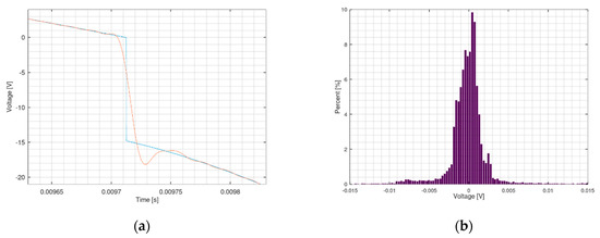Voltage across at the nonlinear element: (a) superimposed time-domain graphs (in the Gibbs effect zone): in blue, the result obtained using LTspice, and in red, the result obtained using the Hănțilă method; (b) histogram illustrating the time-domain voltage difference between the proposed method and the LTspice results.