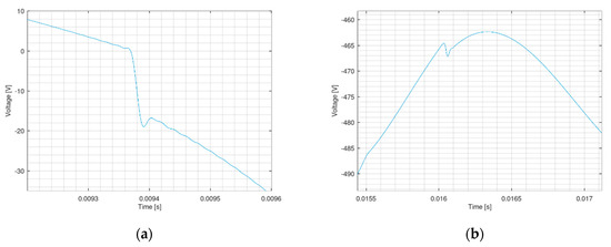 Voltage across the nonlinear element in the time domain—Gibbs effect: (a) Detail 1; (b) Detail 2.