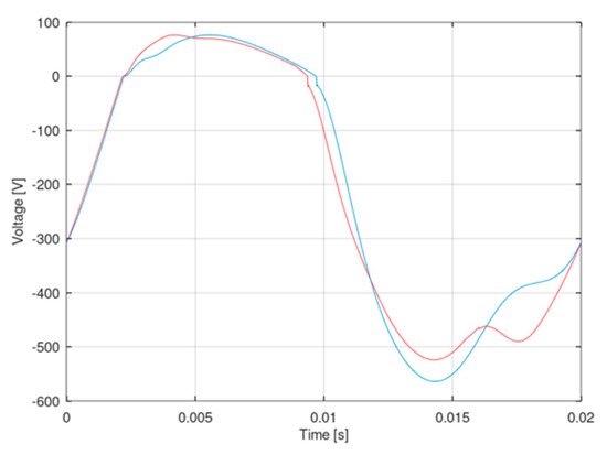 Comparison of the voltage across the nonlinear load in the time domain (illustrative example 1—in blue vs. Illustrative example 2—in red).
