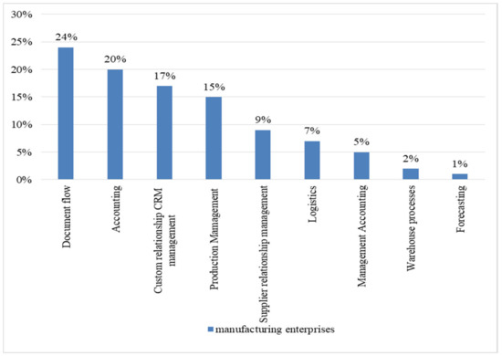 Considering the automated business processes of manufacturing enterprises of the Republic of Mordovia (Figure 1), it should be noted that manufacturing enterprises use ICT in such areas as—Document flow 24%, Customer relationship management (CRM)—17%, Accounting—20%, Production management—15%, Supplier relationship management—9%, Logistics—7%, Management accounting—5%, Warehouse processes—2%, Forecasting—1%.