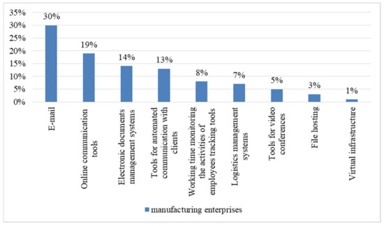 Examining the ICT tools used at the enterprises of the Republic of Mordovia, it can be noted (Figure 2) that manufacturing enterprises note the following options: E-mail—30%, Tools for online communication—19%, Electronic document management systems—14%, Tools for automated communication with customers—13%, Tools for accounting for working hours and monitoring the activities of employees—8%, Logistics management systems—7%, Tools for video conferences—5%, File hosting—3%, Virtual infrastructure—1%.