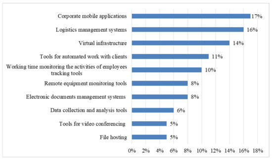 Figure 3 shows the following percentage, based on the analysis of the opinions of representatives of manufacturing enterprises of the Republic of Mordovia on the demand for new ICT tools: Corporate mobile applications—17%, Logistics management systems—16%, Virtual infrastructure—14%, Tools for automated work with clients—11%, Working time monitoring the activities of employees tracking tools—10%, Electronic document management systems—8%, Tools for remote monitoring of equipment—8%, Tools for collecting and data analysis—6%, File hosting—5%, Tools for video conferencing—5%. Based on the data, it can be concluded that Mordovian enterprises are considering more advanced ICT tools that become more relevant over time. The majority of enterprises preferred corporate mobile applications (17%), the most unpopular were tools for video conferencing, due to the fact that the system for using these technologies is already quite well-established.