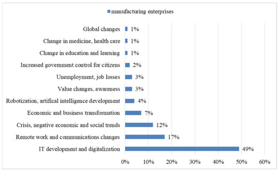 Analyzing the data in Figure 5, it can be seen that 49% of enterprises-respondents in the production sector believe that the world is currently changing rapidly precisely because of the development of IT and digitalization. According to the study, it can be seen that remote work and changes in the field of communications (17%), the crisis, negative economic and social trends (12%), the transformation of the economy and business (7%), robotization and the development of artificial intelligence (4%), unemployment, job creation (3%), value changes, awareness (3%), state pressure on citizens, increased control (2%), the global nature of changes (1%), changes in the field of medicine, health care (1%), changes in in the field of education, and training (1%).