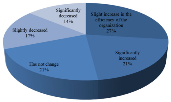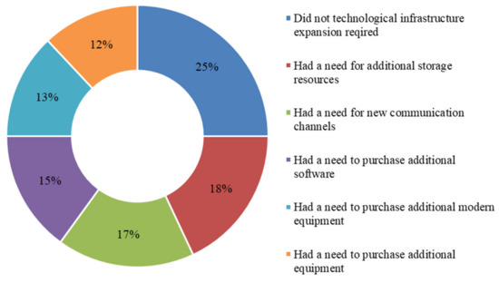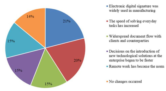 Based on the analysis of Figure 6, it is clear how the pandemic COVID-19 affected the activities of companies. The majority of respondents in the production sector have partially switched to remote work (33%). There are also some companies that operate in the same mode (31%), were forced to suspend their activities (12%), did not switch to remote work, but were forced to significantly change business processes (23%). This is due to the fact that outbreaks of the coronavirus are still occurring, people are infected daily in every city, that is, at present, humanity has not yet overcome the virus and, in order to warn employees of various enterprises as much as possible, organizations are forced to partially switch to remote work. Due to the fact that enterprises can partially perform work remotely, a large number of people are safe from the virus.
