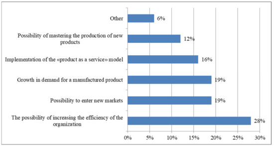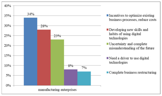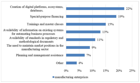 Based on the analysis of Figure 4, it can be seen that a large share of manufacturing enterprises of the Republic of Mordovia noted that one of the relevant technologies for them is business process automatic systems (32%). In addition, autonomous machines and devices (28%), cloud technologies (28%), and artificial intelligence technologies (21%) are also highlighted. Less popular are digital technologies such as robotics (16%), voice technologies (15%), and blockchain technology (8%). These results can be attributed to the fact that the introduction of digital technologies is leading to important changes in the organization of management and operation workflows. Through the use of the latest technologies in the field of digital economy, the speed of data processing and the quality of the information provided at the enterprises of the Republic of Mordovia are increasing. Therefore, manufacturing enterprises of the Republic of Mordovia strive to use, first of all, the latest technologies for automating business processes.
