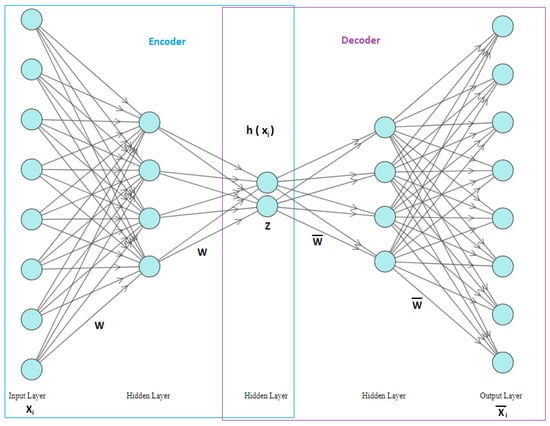 In the following equations, Xi refers to the input data, refers to the reconstructed data, E refers to the encoder function, D refers to the decoder function, z refers to the compressed data, W refers to the weight, B refers to the bias, σ refers to the activation function, and L refers to the loss function. The autoencoder architecture consists of three main layers [7,8], as shown in Figure 1.