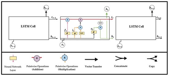 The main part of LSTMs is the cell state, which allows the information to pass through it and apply numbers of processes. The way it functions is similar to the conveyor belt. LSTM organizes data traffic by gates, where it can add or remove data from a cell state via these gates. Every gate consists of a pointwise multiplication operation and a sigmoid neural network layer. The Figure 2 presents LSTM cell architecture; it has four neural network layers: input gate, output gate, forget gate, and cell state, and they have special dedicated ways to interact with each other. Each one of them has its specific task to do [14,15], as following: