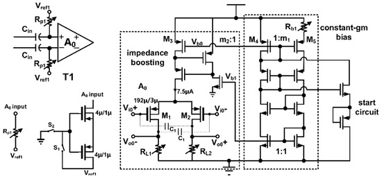 In Figure 2, T1 is designed as a passive high-pass filter (HPF) followed by an open-loop amplifier A0. The electrode dc offset over 1 V is able to be blocked by Cin about 5 pF, and A0’s input is biased by Vref1 by about 0.6 V through pseudo-resistor Rp1, which is formed by two in-series thick PMOS transistors connecting the source and body together. When S1 is closed and S2 is open, PMOS transistors are biased in the deep subthreshold region, so high-pass corner fHP1 is able to be very low, about 5 mHz, and therefore T1 amplifies the neural signal normally. When S2 is closed and S1 is open, fHP1 is increased to about 18 kHz, and T1 recovers quickly in the presence of artificial interference, which may cause several hundred millivolts of fluctuation at the input of the T1. The RL12 are 1.3 MΩ; otherwise, in order to ensure accurate matching between RL12, we connect several resistors in series with RL12, each of which has a resistance of about 25 kΩ and is controlled by a switch.