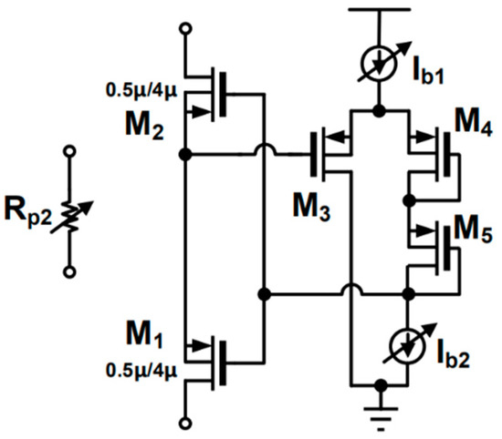 The pseudo-resistors Rp2 and Rp3 used by T21 and T22, respectively, adopt a structure similar to [17]. In Figure 3, Rp2 is realized by two in-series thick PMOS Mp1,2, which can provide dc bias for A1 and determine fHp,sys in parallel with C3. Despite PT variations, the level shifter formed by Mp3–5 and tunable Ib1,2 can reduce Rp2 ‘s resistance spread. The resistance for Rp2 is determined by the override voltage of Mp1,2, which can be written as: