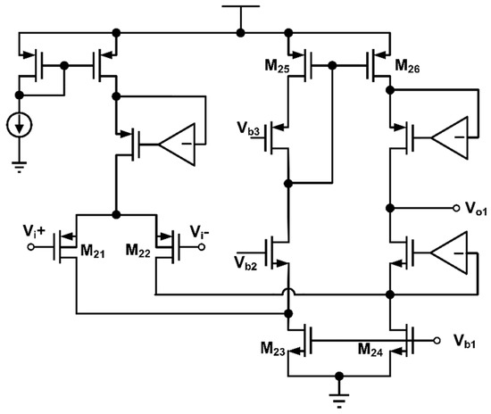 Because T1 and T2’s total gain is able to reach 128 at most, T2’s amplifier output’s voltage headroom and open-loop gain should be large enough to maintain linearity. In Figure 5, a folded-cascode amplifier is used by A1, A2, and A2a. The peak-to-peak value of output swing can be as large as 1.2 V, and auxiliary amplifiers are used to boost impedance and open-loop gain. In terms of low RTI noise, the amplifier consumes less power due to T1’s gain. In order to reduce the noise contribution from M23–26, M21,22 are biased in the subthreshold region, while M23–26 are biased in the strong inversion region and have a large size. In addition, the static current flowing through M21,22 should be several times the static current of M25,26.