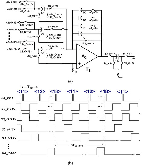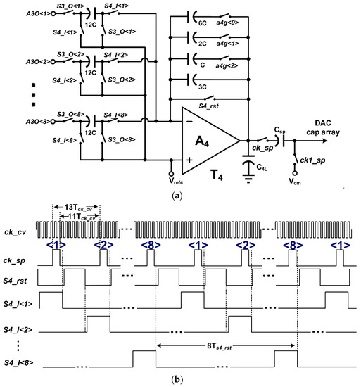 In Figure 6b and Figure 7b, the clocks with the opposite phases do not overlap each other. For T3, within a Ts3, there is the amplification phase S3_I <1 X> (X = 1–8) and the reset phase S3_rst <1>. The delay between T3’s amplification phases for two adjacent channels is Ts3. Because the switch’s charge injection and clock feed-through effect have greater influence on A3‘s input than output, S3_O <1> is turned off earlier than each S3_I <1 X>. In Figure 7a, T4 not only serves as the multiplexed stage for the eight T3s but also drives the SH capacitor Csp of SAR ADC. The period Tck-sp of ADC’s sampling switch ck_sp is equal to Ts4, which equals 13 times that of Tck_cv, which is the synchronous clock inside SAR ADC. The switch ck_sp keeps high for 2Tck_cv. Within a Ts4, there is the amplification phase S4_I <1 X> (X = 1–8) and the reset phase S4_rst. The delay between T4’s amplification phases for two adjacent T3s’ outputs is Ts4.
