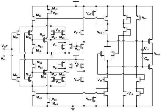 SC amplifier’s limited bandwidth and large voltage offset will stay at A4‘s input for a while, and at least one differential pair of the input stage is able to work. In order to improve open-loop gain, the amplifier’s first stage is a current-mirror cascode structure, and the second stage is a Class-AB push–pull structure with a trans-linear bias circuit. A Miller compensation capacitor is added to obtain enough of a phase margin.