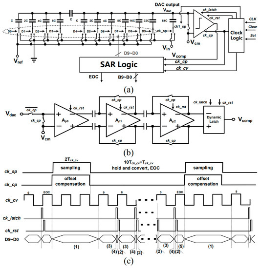 (a) The schematic of SAR ADC. (b) The schematic of comparator. (c) The timing diagram of SAR ADC.