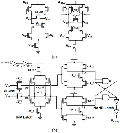 in which D9–D0 is equal to ‘1’ or ‘0’. In the conversion state, because Vdac gradually approaches Vcm and Vref ranges from 0 to 1.8 V, the variation in the comparator’s input common-mode voltage can be no more than 0.225 V. Therefore, the input stage of the preamplifier can always work properly, and its input-referred offset variation is small. In Figure 10a of the preamplifier, Ap0 has a gain of about 5, and Ap1,2 has a gain of about 10. When ck_rst is high, the output of the preamplifiers is shortened to eliminate the residue state caused by the last bit’s conversion to avoid a hysteresis effect. Figure 10b shows a conventional-sense amplifier, including an inverter-based (INV) regenerative latch, followed by an NAND-based latch. When ck_latch is ‘0’, consuming little static power, the INV latch has been reset and then follows Ap2’s output, while the NAND latch keeps the last state. When ck_latch is ‘1’, the INV latch works, and the following inverter and NAND latch restores its output to the logic value Vcomp, which is the compared result for the current bit.