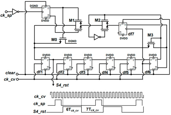 In Figure 11 of the proposed digital circuit, S4_rst can be generated. As the delayed clock of the external clock CLK, ck_cv is the synchronous clock for all D flip-flops. Before the synchronization of all clocks, by setting clear to ‘0’ through SPI, all clocks and clock logic circuits are cleared. Once clear is set to ‘1’, ADC starts to work. Before the first falling edge of the ADC sampling clock ck_sp, M0 and M2 are on, M1 and M3 are off, df7 outputs Q = ‘1’, and S4_rst is ‘0’. After ck_sp’s first falling edge, M0 turns off and M1 turns on, and the next rising edge of ck_cv triggers S4_rst = ‘1’. After 5 Tck_cv and ck_cv’s rising edge, df6 outputs Q = ‘1’, M2 turns off and M3 turns on, and S4_rst remains as ‘1’ for another Tck_cv. Clock ck_cv’s next rising edge triggers S4_rst = ‘0’. After 5 Tck_cv and ck_cv’s rising edge, df6 outputs Q = ‘0’, M3 turns off and M2 turns on, df7 outputs Q = ‘0’, and S4_rst remains as ‘0’ for another 2 Tck_cv. So far, ck_sp is aligned to S4_rst, and all the clocks can be synchronized in the following repeated cycle.