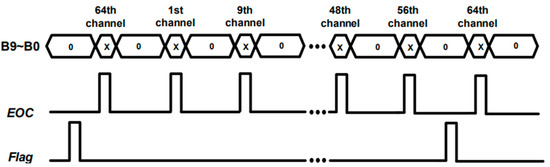 When the chip worked with an input clock of 16 MHZ, the analogue part consumed 4.3 mA, including signal conditioning circuitry, ADC, bandgap reference and bias circuit, and the digital part consumed 0.3 mA. The total power consumption was about 8.28 mW with an average heat of 517.5 μW/mm2, which is less than the heat budget of 800 μW/mm2 [10]. The average power consumption of each channel was about 130 μW. After the operation for clock synchronization by using SPI, Figure 14 shows that from the logic high state of Flag, one ADC sampling period later, ADC output data of the first channel firstly and then other channels in the sequence of channel 1, 9, 17, 25, 33, 41, 49, 57, 2, 10, 18, 26, 34, 42, 50, 58, 3, 11, 19, 27, 35, 43, 51, 59, 4, 12, 20, 28, 36, 44, 52, 60, 5, 13, 21, 29, 37, 45, 53, 61, 6, 14, 22, 30, 38, 46, 54, 62 7, 15, 23, 31, 39, 47, 55, 63, 8, 16, 24, 32, 40, 48, 56 and 64.