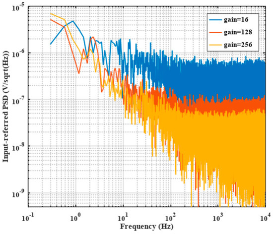 In noise measurement, one channel’s differential inputs were shorted to the ground, and all corresponding ADC 10-bit data were selected and converted back to analogue signal. After dividing the output by the system gain, the RTI noise PSD was calculated and is plotted in Figure 15. It can be seen that with the increasing system gain, the RTI noise decreases to a constant value. When T1 and T2 had a total gain of 16, and T3 and T4 had a gain of 1, within 1 Hz–10 kHz, the system’s integrated RTI noise was about 32 μVrms, which was dominated by T3, T4, and ADC. When T1 and T2’s gain was increased to 128, the integrated RTI noise was about 6.2 μVrms. Furthermore, T3’s gain was programmed to 2, the system gain became 256 or more, and the integrated RTI noise was about 5.5 μVrms, which was dominated by T1 and T2.
