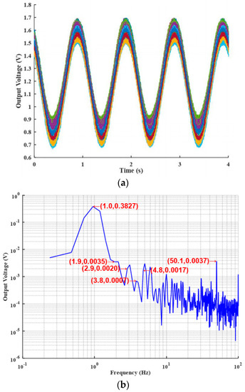 All channels’ (a) output waveforms, (b) frequency spectra from 3 mV–1 Hz sinusoidal input.