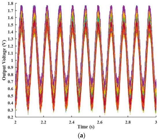 From the output waveform, it can be seen that there was a dc offset between different channels, which is because the adopted pseudo-resistor has resistance and leakage current variations. In Figure 3, the parasitic diode in reverse biasing between PMOS N-well and P-substrate has a leakage current related to process, temperature, and light [33]. In Figure 4, because the negative input of A2 is virtually ground and fixed by Vref, Rp3’s leakage current flowing through itself can cause DC offset at the output of A2. This offset may saturate the amplifier and the system; thus, the system’s maximum gain is 512 for now to ensure enough voltage headroom.