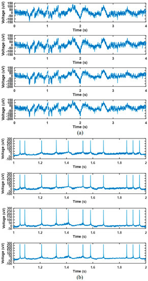 From the CRCNS (Collaborative Research in Computational Neuroscience) website, the raw neural data were downloaded, which is provided by the laboratory of Professor Gyorgy Buzsáki of New York University. The neural data recorded the CA1 region of the hippocampus of anesthetics rats, including extracellular LFP signals and AP signals of about several hundred millivolts [34]. To minimize the noise floor of the test instrumentation and cables, neural signal was pre-amplified by 50 in Tektronix AFG3252, and then was input into the system through a 1/50 attenuation network and electrode impedance network. In the test, ADC’s total output data were distributed to 64 channels and divided by 512 to obtain the equivalent input neural signal of each channel. Since neural signal is not concerned with the dc component, the data recorded in all channels were subtracted from the corresponding dc component. Figure 18a,b show arbitrary four-channel LFP and AP signals with amplitude fluctuations of about 200 μV and 300 μV, respectively. The AP signal is mainly composed of multiple fast spikes. In Figure 19 of the zoomed-in waveform of Figure 18b, the spike has a duration of about 2 ms.