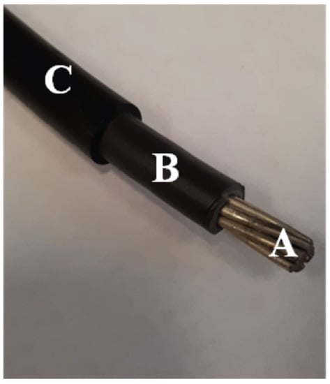 The LV unshielded NPP cable under consideration. A—Tin-coated copper, B—XLPE insulation, C—CSPE jacket.