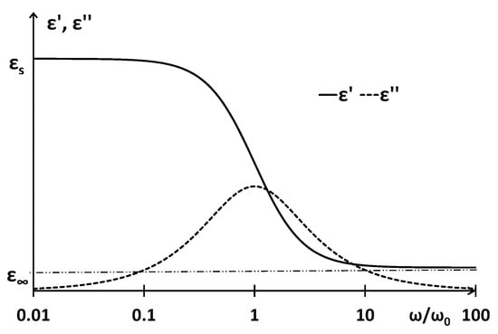 where and are defined as the real and imaginary parts of permittivity since the former depicts the strength of the dipoles in the material aligning themselves when an external electric field is applied. This part is known as permittivity characterizing the electric energy stored within the dielectric material [,]. The imaginary permittivity represents the losses in the material due to conduction and polarization. The dissipation factor or tan is the ratio of the imaginary and real parts of permittivity (tan = /). Modeling a relaxation process by the Debye model, the real and imaginary parts of permittivity as a function of angular frequency can be expressed by the following equations: