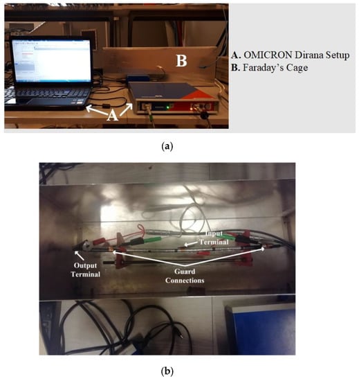 The test setup: (a) Omicron Dirana equipment; (b) cable sample in the Fraday’s cage.