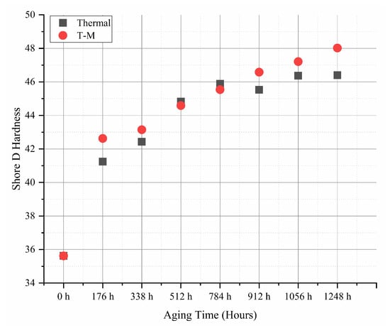 Shore D hardness against aging time thermal and thermo-mechanical (T-M) aging.