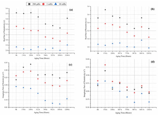 Real part of permittivity for (a) thermal aging, and (b) thermo-mechanical aging; imaginary part of permittivity for (c) thermal aging, and (d) thermo-mechanical aging at selected frequencies.