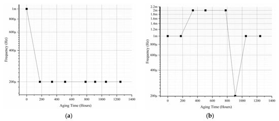 The loss peak frequencies are also plotted for thermal and thermo-mechanical aging (Figure 9). For an unaged cable sample, a polarization peak was observed at 1 mHz, which with aging, was shifted to 200 μHz Figure 9a. Nevertheless, the curves of Figure 5b suggest in the case of aged samples, the peak of the polarization peak should be below 200 μHz. In the case of the T-M stress, the polarization peak did not change its position after the first aging period. However, it shifted to a higher frequency of 2 mHz until the fourth aging period and then to 200 μHz after the fifth aging period, Figure 9b. At the same time, it shifted back to 1 mHz after the sixth period and remained as it for the seventh period.