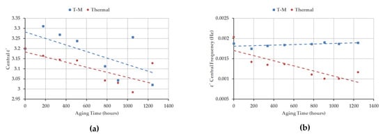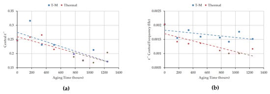 Figure 11a shows the CIP change with aging in case thermal and T-M aging. In both cases, the dielectric loss increases at the beginning of aging. The CIP increases in the first two aging periods of thermal aging. A more significant increase can be observed in the first aging period of T-M aging, then the CIP values decrease. By calculating the linear trend, no significant difference can be observed between thermal and T-M CIP values. The IPCF values (Figure 11b) were dropped by 0.5 mHz after the first aging round, then the IPCF of thermally aged samples decreased, while that of T-M samples shows a small variation, a minimal decreasing trend can be observed. The calculated linear trends suggest the IPCF values of T-M samples are higher 0.5 mHz at the ending of aging. The trendlines show the curves shifted towards higher frequencies in the case of T-M aging. Hence the polarisation peaks are at higher frequencies than the thermally aged samples.