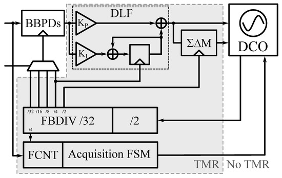 - Prinzie, J.; Steyaert, M.; Leroux, P.; Christiansen, J.; Moreira, P. A single-event upset robust, 2.2 GHz to 3.2 GHz, 345 fs jitter PLL with triple-modular redundant phase detector in 65 nm CMOS. In Proceedings of the 2016 IEEE Asian Solid-State Circuits Conference (A-SSCC), Toyama, Japan, 7–9 November 2016; pp. 285–288. [Google Scholar] [CrossRef]
