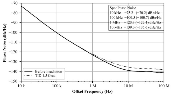 Repeated measurements of the tracking bank tuning step size performed during the irradiation did not show a noticeable change. As the loop gain is otherwise determined primarily by the DLF, whose coefficients are insensitive to TID, the dynamic behavior of the PLL remained largely unaffected by the irradiation. This can be concluded from Figure 8, which compares the pre- and post-irradiation closed-loop noise performance. An increase in phase noise consistent with the previously discussed oscillator degradation can be observed. No locking failures have been observed during the test procedure, the PVT and acquisition banks were able to compensate for the oscillator frequency shift according to expectations and the output clock delay with respect to the reference clock remained repeatable across the irradiation. No failures of the DLF, EΔM and divide-by-32 FBDIV were observed during the irradiation procedure, implying that the chosen synthesis strategy was adequate to achieve high radiation tolerance.