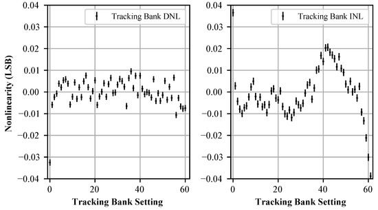 To validate the custom tracking cell design, the linearity of the tracking bank was further characterized. The very small capacitance of the individual cells demands particular attention during measurements due to the drift of the free-running oscillator. For each tracking bank cell, two measurements were performed, comparing the oscillator frequency at two settings: One of the measurements is performed with all unit cells disabled, while during the second measurement, a fixed number of them are enabled. The obtained frequency difference between these short measurements is stable across long-term drifts of the oscillator, and therefore, multiple measurements can be averaged to reduce the measurement uncertainty. The characterization results can be seen in Figure 7. The thermometric bank offers exceptional differential and integral nonlinearity of better than worst case LSB across the full range and a mean frequency step size of ppm or kHz per cell. This is equivalent to a capacitance difference of 61 per cell, which is well in agreement with the electromagnetic simulations.
