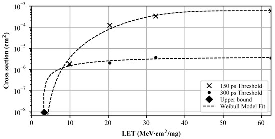 The experimentally determined SEE cross-section to heavy ion irradiation for two different phase excursion thresholds is shown in Figure 10. These measurements can be summarized as follows: A large cross-section but low magnitude sensitivity can be attributed to the spiral inductor. Temporary, positive frequency errors of the oscillator are stimulated by the irradiation of this large area [30]. This effect, while responsible for a saturation cross-section on the order of 1 × 10−3 cm2 in this circuit, will not be discussed further here, as it exists in LC oscillators using planar inductors regardless of their loop architecture and also only results in small phase errors that scale with LET. As the underlying cause is a frequency error of the oscillator, the accumulated loop phase errors can be reduced by increasing the loop bandwidth. The responses of the circuit to this effect have been confined to phase excursions below 250 ps. This sensitivity has been previously discussed in [30].