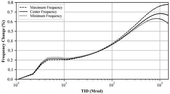 During the irradiation, a consistent increase in the DCO free-running frequency was observed across all supply voltage and tuning control word settings. The evolution of the oscillation frequency at three different frequency settings is shown in Figure 12. The worst observed frequency shift remained within %, which is small compared to the total tuning range available (20%). This shift is a result of a change in common mode voltage and oscillation amplitude caused by the radiation-induced reduction in transconductance in the oscillator active devices [16]. Comparing this DCO design to the VCO design adopted in [9], we can find that the radiation-induced frequency shift is significantly reduced. As outlined in Section 4, the MOS varactors used in VCO designs tend to show a strong amplitude dependence, while the majority of capacitance in this DCO design is contributed to by MOM capacitances. The dominant nonlinear capacitance loading the tank in this design is the junction capacitance of the capacitor switches, which explains the significantly reduced sensitivity. This finding highlights the advantage of a varactorless DCO implementation over VCOs in terms of TID tolerance.