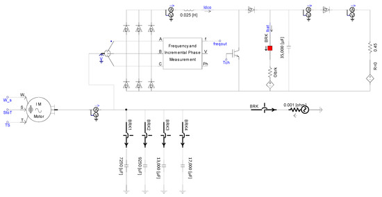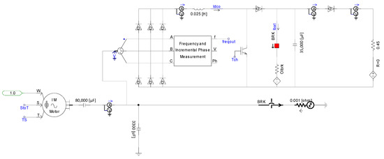 In this configuration, the electrolyzer is modeled in a parallel connection of a resistor and a DC voltage source. Figure 10 shows the system configuration where the SEIG is connected to the parallel excitation capacitor of 2100 µF, and the three-phase AC output generated from the SEIG is delivered to the three-phase diode rectifier and then a boost converter connection between the diode rectifier and the modeled electrolyzer circuit. The SEIG has speed (W), switch signal (S), and torque (T) signal ports. The SEIG can be controlled in speed and torque control modes.