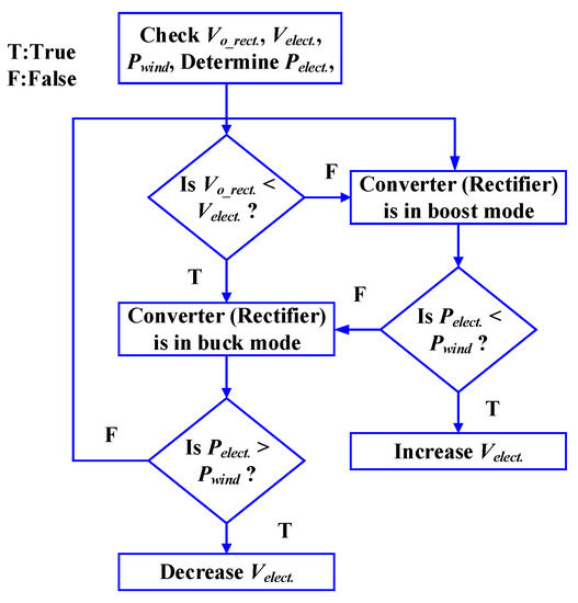The optimum power derived from Equation (5) can be assumed to make the analysis simple, that the rotor speed varies proportionally as the wind speed changes. Based on the sensed voltages, the mode of the power converter is determined, that is, whether it can be in a boost or buck mode. For example, if the output voltage Vo_rect. of the diode rectifier is less than the electrolyzer voltage Velect., or the output voltage of the power converter, the power converter will be operated in the buck mode; otherwise, it can be operated in the boost mode. Once the mode of the operation of the power converter is decided, the electrolyzer power Pelect. is compared with the ideal wind power, Pwind. Thus, in the buck mode, if Pelect. is bigger than Pwind, the output voltage of the power converter or electrolyzer voltage Velect. is decreased; otherwise, Velect. would be increased in the boost mode, and vice versa.