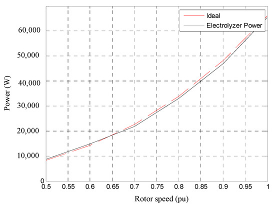 Details of the power control algorithm for the electrolyzer are shown in the flowchart of Figure 3. First, the output voltage of the three-phase diode rectifier in Figure 1 and the input voltage to the electrolyzer is sensed, and the power of the electrolyzer is calculated. Secondly, the ideal power of the wind turbine is extracted from the cubed rotor speed (n) in revolutions per minute (rpm) of SEIG with the computed data, Kp, as in [2]: