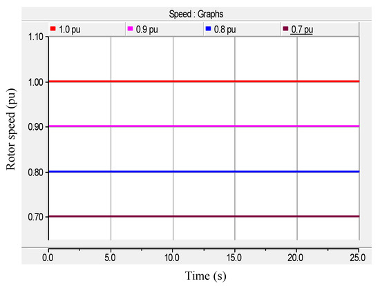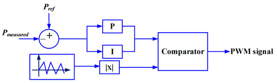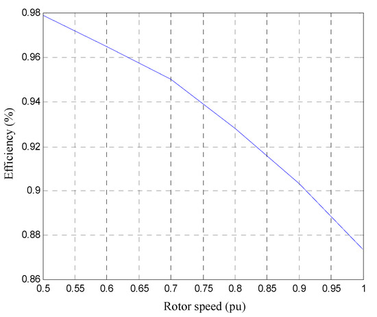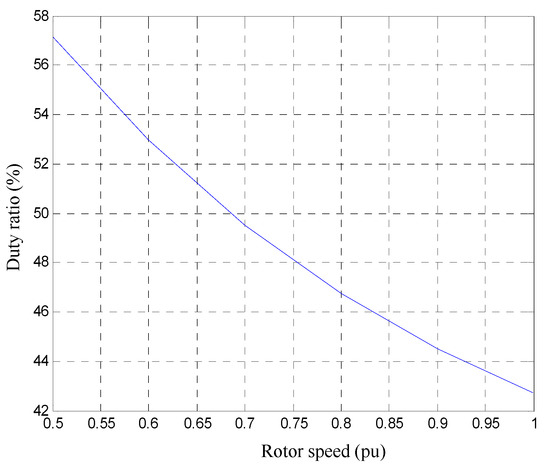 Figure 4, Figure 5 and Figure 6 show MATLAB results by enforcing the proposed power control algorithm based on the flowchart seen in Figure 3. Figure 4 shows the power versus the rotor speed curve. From the figure, the power of the electrolyzer exponentially increases with an increase in the rotor speed. The electrolyzer power almost nearly matches the ideal power required within a system. Figure 5 shows the efficiency of the system against the rotor speed. The efficiency is high at a low-speed condition but decreases at higher speeds. The rotor speed is to be regulated optimally to ensure efficiency for the system. The duty ratio to drive the converter within the system circuit is plotted against the rotor speed, as shown in Figure 6. The duty ratio is decreasing with increasing rotor speed. However, the ideal duty ratio is attained for the optimal operation of the converter. The power is inversely proportional to the efficiency and duty ratio with increasing speeds. Figure 7 presents the block diagram of the active power controller modeled in PSCAD. Pmeasured and Pref are the SEIG measured power and the reference power, respectively. In Figure 7, a proportional and integral (PI) controller is utilized where its output is compared with a triangular signal generator. The PI controller calculates an error signal by taking the difference between the measured and reference powers. The reference power is the power at which the system is expected to operate, and ideally, we expect the system to operate near its maximum power without any disturbances. The DC/DC boost converter obtains a 1.5 kHz of PWM signal from a triangular signal generator for active power control in high power applications over 100 kW. The PI controller’s gains are decided through analytical approaches.