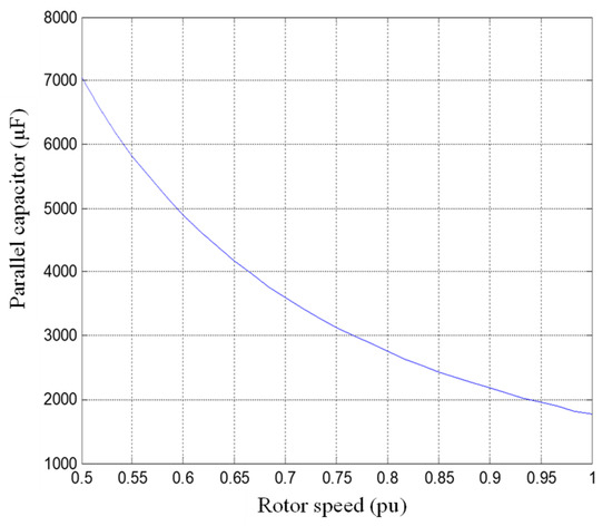 where for ωm is the angular rotor speed (rad/s), Lm is magnetization inductance (H), Lls is stator leakage inductance, and Llr is rotor leakage inductance (H). Figure 8 and Figure 9 show each capacitor variation based on the rotor speed variation. From Equations (6) and (7), we notice the capacitance is inversely proportional to the square of speed. Thus, an increasing speed requires a lower minimum capacitor for self-excitation and vice versa; consequently, as the rotor speed increases, each capacitor tends to be decreased. Additionally, if sufficient capacitors are connected as required at the rotational speed of the generator, the generator can operate as a self-excited generator. However, it is necessary to have full knowledge of the phenomenon of self-excitation that produces a voltage across the generator decided by the capacitor and speed.
