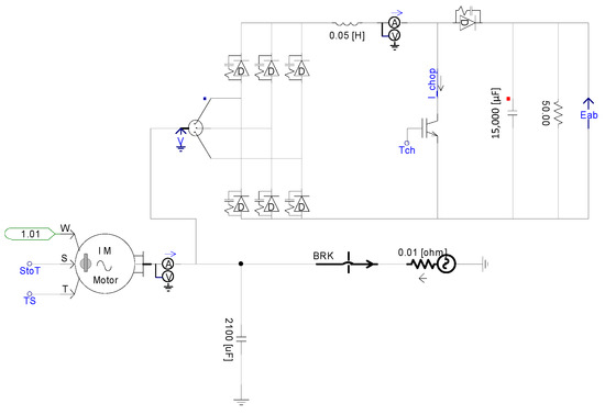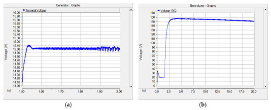The structure of an electrolyzer could consist of complicated mechanical dynamic flow models [19] or several resistors, and capacitors based on an equivalent circuit model [19]. An electrolyzer can be applied to complex modeling, controls, and optimal sizing design with a DC/DC converter, and wind–hydrogen production [20,21,22]. Due to the combination of the wind system, AC/DC, and DC/DC converters, the electrolyzer is modeled as a simple circuit model consisting of a resistor and ideal voltage source in series because it is connected to the power converter generating a voltage or current source. According to the parameters of the electrolyzer [7] shown in Table 1, our electrolyzer parameters are re-scaled. In [8], the line-to-line voltage of SEIG is given as 1.6 kV.