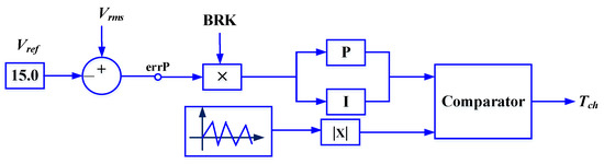 Figure 11 shows the PSCAD schematic diagram for the active power controller for the converter. A reference voltage is compared with the RMS voltage. The error is multiplied by an open breaker time value, then the result is put through a PI controller. The output of the PI controller is compared with the magnitude of a triangular waveform and the output of the comparator is the control signal (Tch) for the converter.