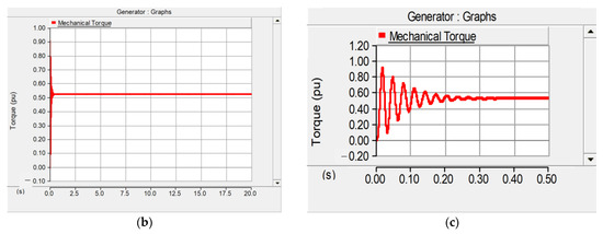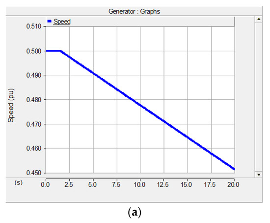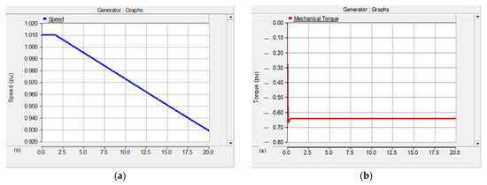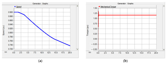 Figure 27 shows the speed and torque pu graphs. The system configuration breaker is set to open at 10 s, and the switch is turned to the torque input at 9.0 s. The torque is sampled and held when switched from constant speed to torque. In addition, in this case, the speed reduces gradually decreases after, whereas the torque is constant, similarly to the first case.