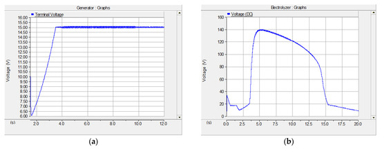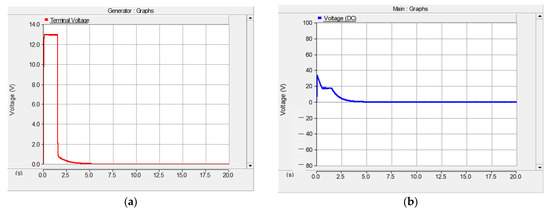 Figure 28 shows the system DC and terminal voltages graphs, respectively. The system DC voltage increases for supply to the load after the speed reduces and the torque is maintained constant. The magnitude of the terminal voltage increases and decreases after 15 s due to the speed and torque change, and also the source power supply contribution into the system throughout the whole operation. The terminal voltage in this case restores to its reference voltage of 15 V to ensure stability when the speed suddenly begins to decrease. Similarly, the terminal voltage is within ± 0.1 V of the reference voltage (14.9–15.1 V). In this case, the magnitudes of the voltage decreased with the decrease in the speed as compared with the first case, resulting in varying voltage experienced in the system.