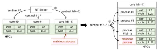 Figure 1 depicts RT-Sniper’s two-phase operation for detecting malicious processes. RT-Sniper launches sentinels on each physical core (1) to collect core-level HPCs. Each sentinel periodically collects hardware events to compute core’s suspect score based on the collected HPCs. The detailed score computation method will be described in the next section. Then when the score of a certain core is greater than the predefined threshold level, the core is piked for further scrutiny. The sentinel of the selected core then collects HPCs of the processes that are running on the core (2). RT-Sniper calculates the suspect score of each process to block the processes whose score is greater than the process-level threshold.