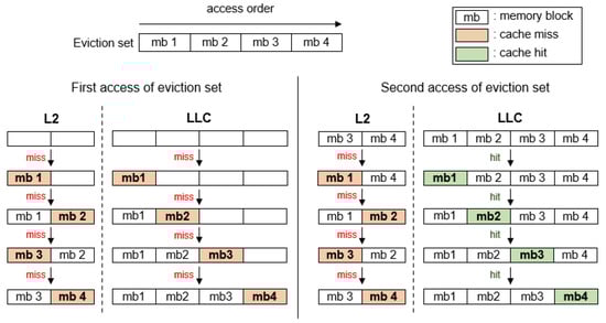 L2 miss rates: RT-Sniper uses L2 miss rates of physical cores and running processes to detect cache side-channel attacks, since the attacks exploit an eviction set in LLC [,,]. Figure 2 illustrates how L2 misses are incurred by an LLC eviction set. In this example, we assume the L2 cache is a 2-way set-associative cache with LRU replacement policy and LLC is a 4-way set-associative cache. The first requests for the eviction set (i.e., four blocks from mb1 to mb4) result in cold misses in both L2 and LLC since the requested blocks do not exist in both caches initially. After the first requests for the eviction set, the target cache set in LLC includes all four blocks (mb1–mb4); however, the target set in L2 has only the two latest blocks (mb3 and mb4). In the same way, the subsequent requests for the same eviction set encounter cache hits in LLC and the cache missed in L2. This simple scenario explains why high L2 miss counts are observed when cache side-channel attacks are performed. Considering that LLC has 1.5 to 2 times higher associativity compared to L2 [], the cache side-channel attacks that exploit cache eviction sets typically exhibit high L2 miss counts.