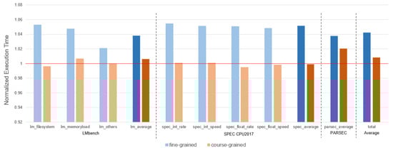 Figure 3 shows the normalized execution times of three benchmark suites while RT-Sniper is running. With a 1 ms sampling period, LMbench takes 3.82% more time on average. The file-system applications were mostly affected by a 5.3% increase, and the memory-load applications were affected by a 4.7% increase. The SPEC2017 takes 4.8–5.4% more on average. The 10 ms sampling incurs a negligible impact on the execution times of single-threaded benchmarks. The execution time of SPEC2017 and LMbench was increased a less than 1%, even in the worst case. The execution time of multi-threaded PARSEC increased 2.05% on average. We strongly believe that the barriers in PARSEC make the other threads wait until the sentinels are switched out.